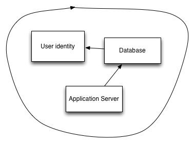 We have here an application server, a database, and our user’s identity. They form the assemblage of our system. Remember, abstract concepts are objects just as code and servers are! Our identity notion is stored within the database, therefore, they’re connected.