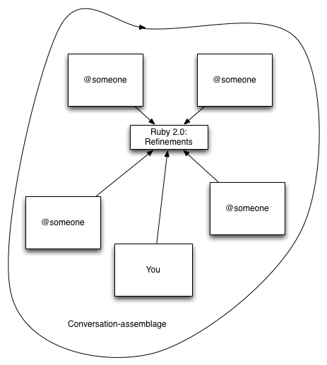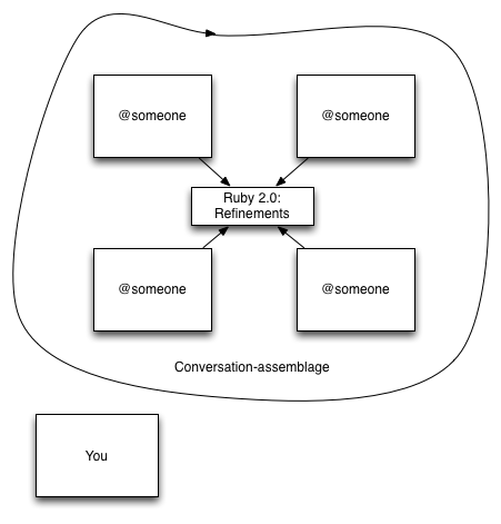 They form an assemblage we call a ‘conversation.’ It’s in relation with an object known as “refinements” from Ruby 2.0, which means this assemblage is likely to be particularly vibrant. Heh. Anyway, you decide that your opinion matters, so you de-territorialize the assemblage, and (assuming they don’t ignore you) it re-territorializes around you: